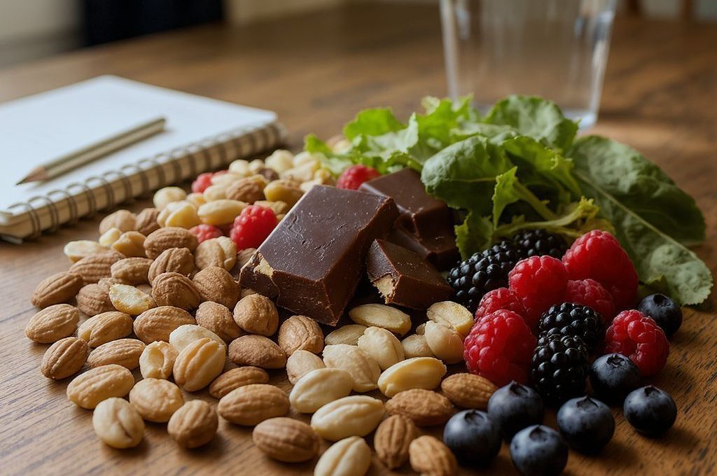 • Flavonoidok és antociánok: Bogyós gyümölcsök (áfonya, málna, eper), étcsokoládé, vörösbor. Javítják a véráramlást az agyban, támogatják az idegsejtek közötti kommunikációt és védik a sejteket az oxidatív károsodástól.